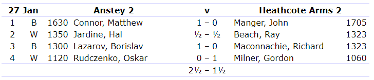 On 27th January it was a busy night in the Anstey Chess club. Our second team engaged in a serious four-board battle against the experienced team of Heathcote Arms 2 in an attempt to achieve second win in a row and get their revenge for a crushing 4-0 defeat back in October. In the opposite corner of the Anstey Methodist Church, the casual and first team players engaged in the usual sharp and fun chess battles typical for club nights. The cherries on the top were our birthday boys Oscar and Julian who brought plenty of treats and chocolate to the party. We wish them all the best and plenty of wins to come their way!
