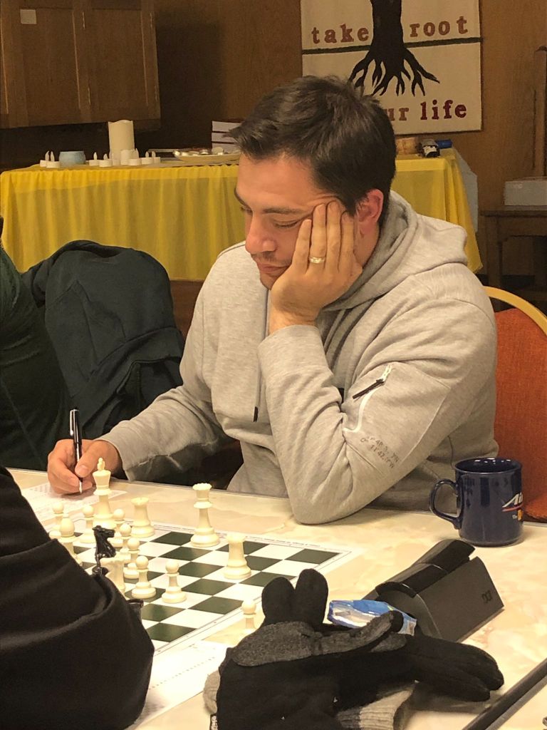 With Hal and Leo unable to play on the night, it was down to the first team to help out. The man of the evening ended being Mick, who readily stepped up to the occasion and sat down on board 1. Our teammate had the black pieces facing the wily and experienced Jim Bingham, who was also the highest rated player in the whole building (current rating, John Sr. has been rated well into the 2000s in his glorious past). After 1.d4 Mick replied with his benchmark e6, b5 and a6 setup, facilitating slow development and striking on the centre with pieces. His opponent decided to strike back by taking as much space in the centre as possible. A cagey middle game followed, then in his tactical style Mick decided to try and blow open white’s K-side with an attack by sacrificing a piece. Unfortunately, the Braunstone player was able to consolidate the position and gave some material back, leaving him a pawn up on the 6th rank and keeping our teammate’s King and Bishop honest. Aware of the result on Mike and Boris’ boards, Mick offered a draw a couple of times, but his opponent was adamant on converting White’s superior position.