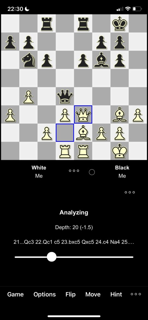 After 19. … f5 20. Qf4, Bob tried d4 which swings the game in SD’s favour, allowing the Knight to deliver it’s plan of Nxb6 and the two Rooks to gang up on the undefendable d pawn which was soon made mincemeat of by SD.