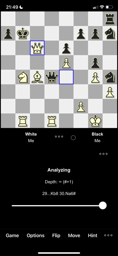 I think that it was Noor who finished next but only just finishing ahead of El Presidente. Noor had the black pieces on board 6, facing off against Chris Brown who had beaten Mike after Mike blundered a piece in the return fixture. The players went down the lines of the Giuco Pianissimo – the quiet Italian which gets both players some play with their pieces. Noor’s slightly unusual approach to retreat the dark squared Bishop and the f6 knight costed him a pawn which was greedily accepted by his opponent. Noor’s pieces got in to a tangle early on as a promising looking Bishop on f4 had to retreat back to c8 after Qf3, threatening both Bishop and the b pawn and white enjoyed a couple of tempi developing pieces. After white’s move 13, the eval bar is at +4.9. After castling, Noor gave up a further two pawns by walking in to a couple of minor tactics deflecting the pawn’s defenders. Indeed, after Qxb7, the eval bar is now at +7.3. Instead of accepting a 4th pawn, Chris (logically) decided to try to trade Queens which the computer doesn’t like, dropping the bar down to +3.3. Some inaccurate play followed from Noor’s opponent and whilst Chris shuffled his pieces, Noor grabbed a pawn back and after a Queen trade, got another pawn back.