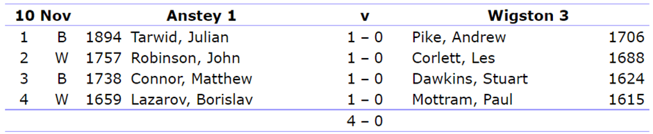 Unfortunately, Andrew then made another mistake, Julian pushed his b-pawn all the way, giving up a rook but queening the pawn. In a hopeless position Andrew’s flag fell. Anstey 4 – Wigston 0.
