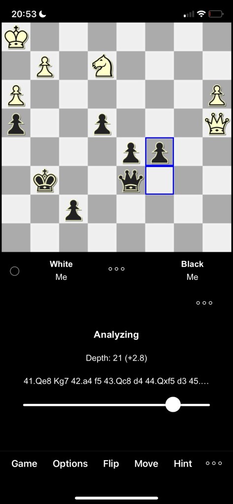 Here, white had played 42. g5 and after hxg5+, 43. hxg5, black simply plays anything but fxg5+, which instantly loses as the advanced white King shepherds his f pawn counterpart to Queening after taking the black g pawn, or after the re-captures, white’s King has the opposition and picks up the remaining black pawns and there is nothing black can do.