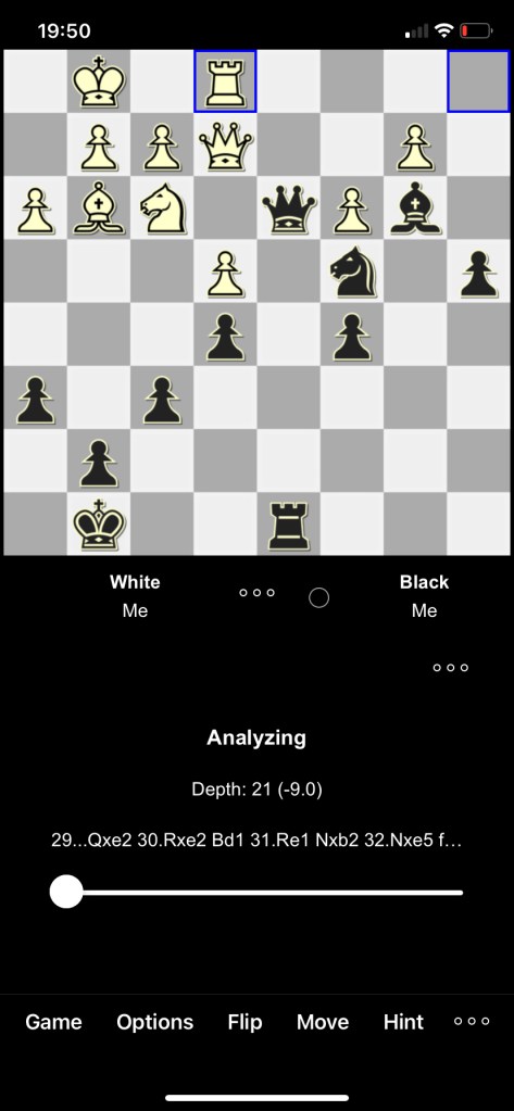 After white’s 29th move, you can see that black is totally winning but El Presidente’s plan was slightly different to that of Smallfish on his iPhone. El Presidente went for the following line:
