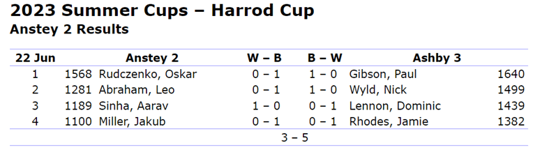 Leo had lost as well on the second board, Jakub on the last, but Aarav on the third winning his second game against Dominic Lennon. This results in the match between Anstey 2 and Ashby 3 to be 3 points to Anstey and 5 points to Ashby (result table below).