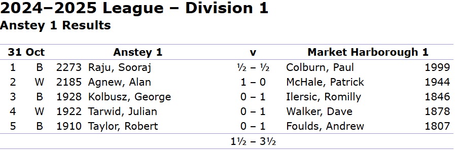 On Thursday 31 October 2024, Anstey hosted their friendly foes Market Harborough at the Anstey Methodist Church Centre, kicking off their first home game of the new LRCA league season. With summer signings Alan Agnew and Bob Taylor making their debuts, and Dave Bray off enjoying jazz in Bologna (nice!), the team was ready for battle. Sooraj led the charge on board one, supported by Julian and George, while captain Matt was left on the sidelines (you could just pick yourself – Ed).