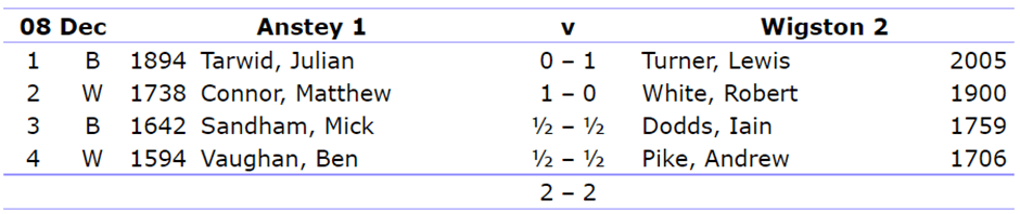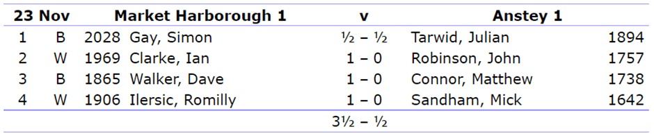 Last to finish was board 1, Julian Tarwid as black against Ian Clarke. The game was even throughout with no side gaining any advantage to speak of (reflected in both sides move accuracy of over 95%). In the endgame Julian activated his rook and pushed and prodded for a weakness but Ian made no mistakes defending. In the end it came down to a completely level opposite colour bishops ending and a draw was agreed. This secured match victory for Harborough. Anstey 1½ – 2½ Market Harborough.