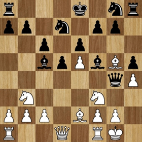 Mick Sandham was white on board 4 against Steve Bizley. Mick got the better of the opening and had a development and space advantage. Steve tried a desperate counter with 12. … e5 but after a few careful moves by white this lost a pawn. Mick then found what looked to be a lovely outpost for his knight on b6 but this turned out to be a blunder: